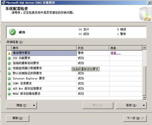 3. 點(diǎn)擊下一步,系統(tǒng)開始對系統(tǒng)配置進(jìn)行檢測,(正常情況有1個警告或者沒有警告,根據(jù)電腦配置而定,這個不影響)。