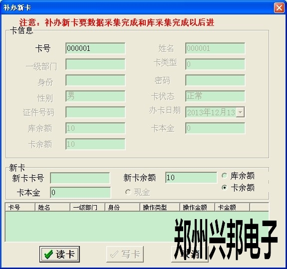 3. 此時(shí)先在軟件中把000001這張卡掛失了,然后點(diǎn)卡管理--補(bǔ)辦新卡(確保數(shù)據(jù)全部采集完),打開對話框后輸入卡號按回車鍵,當(dāng)出現(xiàn)卡信息后,把編號為000001的這張卡放到讀卡器上點(diǎn)讀卡,然后點(diǎn)確定即可。