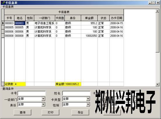 卡信息表主要用于查看卡的基本信息??梢赃x擇相應(yīng)的條件,然后單擊【查詢(xún)】在表格中會(huì)出現(xiàn)相應(yīng)條件的卡的基本信息,表的最下面顯示出所查詢(xún)出的總記錄數(shù)及庫(kù)金額匯總。