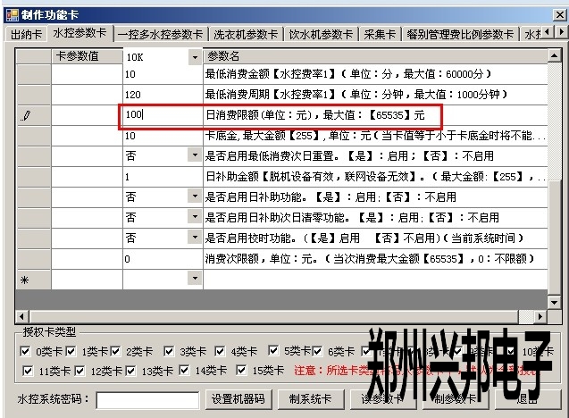 2)打開軟件 制卡中心-功能卡制作-水控參數(shù)卡中的日限額,輸入要設(shè)置的值,以元為單位,如下圖所示,代表100元,最大可設(shè)置到65535元,設(shè)置好后點擊制參數(shù)卡即可;