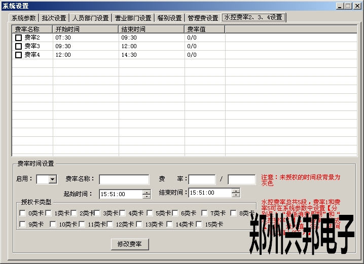 2、設(shè)置幾點到幾點之音流多長時間扣多少錢,在管理中心-系統(tǒng)設(shè)置-水控費率2、3、4設(shè)置里面設(shè)置時間,費率。