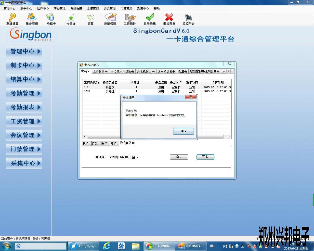 有客戶反應,在使用食堂消費機軟件時登錄出納卡的時候提示己過有效期,進入軟件修改有效期的時間出現(xiàn)了報錯,出現(xiàn)了更新失敗,從字符串向datetime轉(zhuǎn)換失敗。這是什么情況造成的呢?