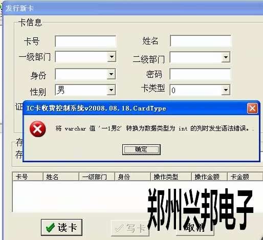 客戶使用的是我們的局域網(wǎng)一卡通食堂售飯機(jī),在使用我們軟件時(shí),新卡無(wú)法發(fā)行,在發(fā)行新卡的時(shí)候出現(xiàn)了將varchar值‘一1男2’轉(zhuǎn)換為數(shù)據(jù)類型為int的列時(shí)發(fā)生語(yǔ)法錯(cuò)誤。